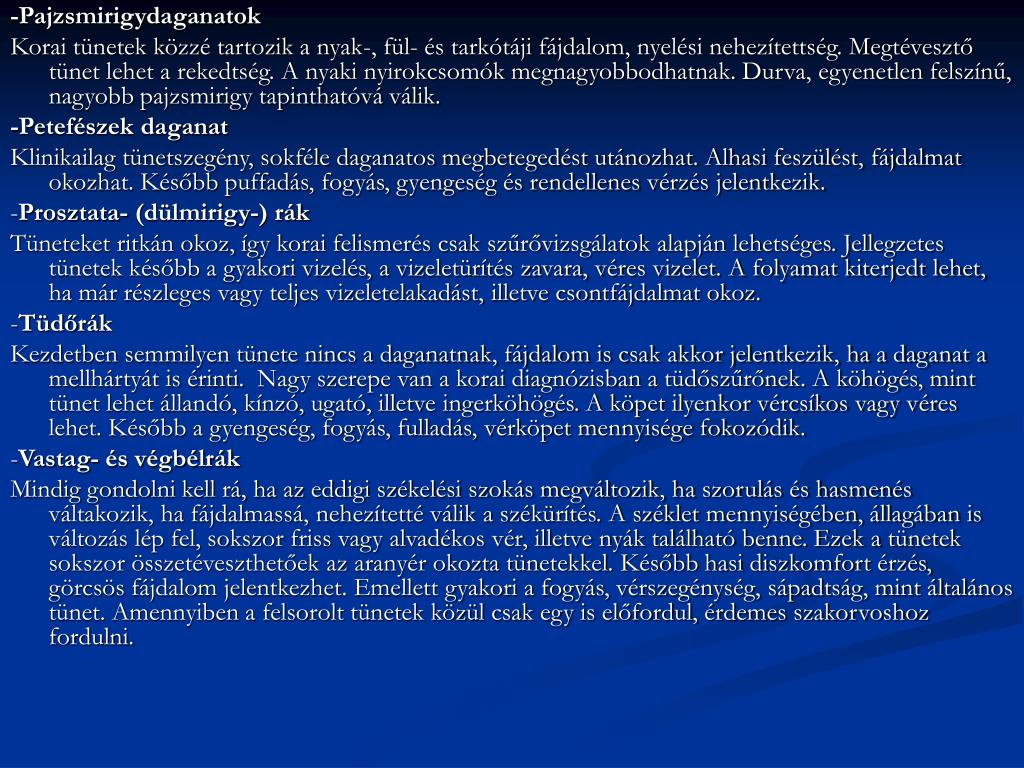 -Pajzsmirigydaganatok Korai tünetek közzé tartozik a nyak-, fül- és tarkótáji fájdalom, nyelési nehezítettség. Megtévesztő tünet lehet a rekedtség. A nyaki nyirokcsomók megnagyobbodhatnak. Durva, egyenetlen felszínű, nagyobb pajzsmirigy tapinthatóvá válik. -Petefészek daganat Klinikailag tünetszegény, sokféle daganatos megbetegedést utánozhat. Alhasi feszülést, fájdalmat okozhat. Később puffadás, fogyás, gyengeség és rendellenes vérzés jelentkezik. -Prosztata- (dülmirigy-) rák Tüneteket ritkán okoz, így korai felismerés csak szűrővizsgálatok alapján lehetséges. Jellegzetes tünetek később a gyakori vizelés, a vizeletürítés zavara, véres vizelet. A folyamat kiterjedt lehet, ha már részleges vagy teljes vizeletelakadást, illetve csontfájdalmat okoz. -Tüdőrák Kezdetben semmilyen tünete nincs a daganatnak, fájdalom is csak akkor jelentkezik, ha a daganat a mellhártyát is érinti. Nagy szerepe van a korai diagnózisban a tüdőszűrőnek. A köhögés, mint tünet lehet állandó, kínzó, ugató, illetve ingerköhögés. A köpet ilyenkor vércsíkos vagy véres lehet. Később a gyengeség, fogyás, fulladás, vérköpet mennyisége fokozódik. -Vastag- és végbélrák Mindig gondolni kell rá, ha az eddigi székelési szokás megváltozik, ha szorulás és hasmenés váltakozik, ha fájdalmassá, nehezítetté válik a székürítés. A széklet mennyiségében, állagában is változás lép fel, sokszor friss vagy alvadékos vér, illetve nyák található benne. Ezek a tünetek sokszor összetéveszthetőek az aranyér okozta tünetekkel. Később hasi diszkomfort érzés, görcsös fájdalom jelentkezhet. Emellett gyakori a fogyás, vérszegénység, sápadtság, mint általános tünet. Amennyiben a felsorolt tünetek közül csak egy is előfordul, érdemes szakorvoshoz fordulni.