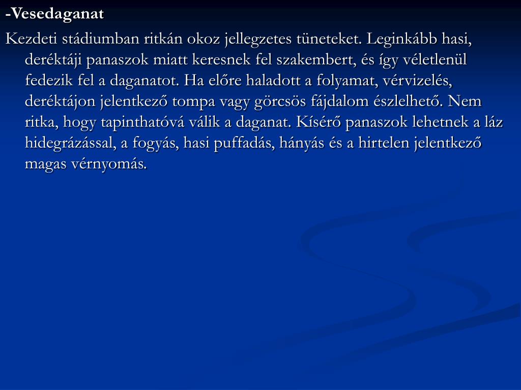 -Vesedaganat Kezdeti stádiumban ritkán okoz jellegzetes tüneteket. Leginkább hasi, deréktáji panaszok miatt keresnek fel szakembert, és így véletlenül fedezik fel a daganatot. Ha előre haladott a folyamat, vérvizelés, deréktájon jelentkező tompa vagy görcsös fájdalom észlelhető. Nem ritka, hogy tapinthatóvá válik a daganat. Kísérő panaszok lehetnek a láz hidegrázással, a fogyás, hasi puffadás, hányás és a hirtelen jelentkező magas vérnyomás.