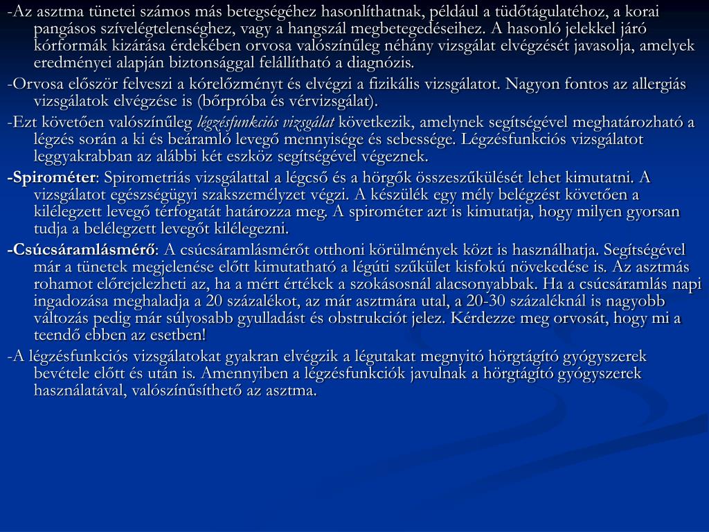-Az asztma tünetei számos más betegségéhez hasonlíthatnak, például a tüdőtágulatéhoz, a korai pangásos szívelégtelenséghez, vagy a hangszál megbetegedéseihez. A hasonló jelekkel járó kórformák kizárása érdekében orvosa valószínűleg néhány vizsgálat elvégzését javasolja, amelyek eredményei alapján biztonsággal felállítható a diagnózis. -Orvosa először felveszi a kórelőzményt és elvégzi a fizikális vizsgálatot. Nagyon fontos az allergiás vizsgálatok elvégzése is (bőrpróba és vérvizsgálat). -Ezt követően valószínűleg légzésfunkciós vizsgálat következik, amelynek segítségével meghatározható a légzés során a ki és beáramló levegő mennyisége és sebessége. Légzésfunkciós vizsgálatot leggyakrabban az alábbi két eszköz segítségével végeznek. -Spirométer: Spirometriás vizsgálattal a légcső és a hörgők összeszűkülését lehet kimutatni. A vizsgálatot egészségügyi szakszemélyzet végzi. A készülék egy mély belégzést követően a kilélegzett levegő térfogatát határozza meg. A spirométer azt is kimutatja, hogy milyen gyorsan tudja a belélegzett levegőt kilélegezni. -Csúcsáramlásmérő: A csúcsáramlásmérőt otthoni körülmények közt is használhatja. Segítségével már a tünetek megjelenése előtt kimutatható a légúti szűkület kisfokú növekedése is. Az asztmás rohamot előrejelezheti az, ha a mért értékek a szokásosnál alacsonyabbak. Ha a csúcsáramlás napi ingadozása meghaladja a 20 százalékot, az már asztmára utal, a 20-30 százaléknál is nagyobb változás pedig már súlyosabb gyulladást és obstrukciót jelez. Kérdezze meg orvosát, hogy mi a teendő ebben az esetben! -A légzésfunkciós vizsgálatokat gyakran elvégzik a légutakat megnyitó hörgtágító gyógyszerek bevétele előtt és után is. Amennyiben a légzésfunkciók javulnak a hörgtágító gyógyszerek használatával, valószínűsíthető az asztma.