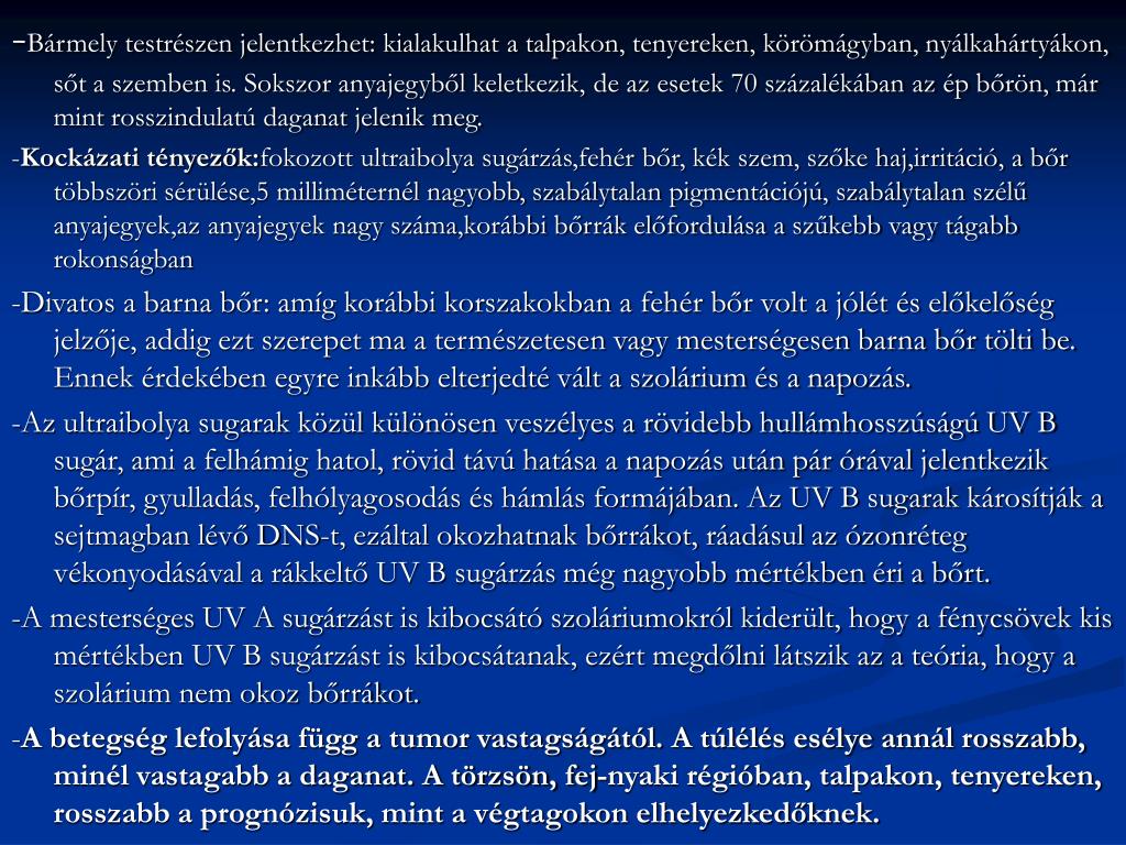 -Bármely testrészen jelentkezhet: kialakulhat a talpakon, tenyereken, körömágyban, nyálkahártyákon, sőt a szemben is. Sokszor anyajegyből keletkezik, de az esetek 70 százalékában az ép bőrön, már mint rosszindulatú daganat jelenik meg. -Kockázati tényezők:fokozott ultraibolya sugárzás,fehér bőr, kék szem, szőke haj,irritáció, a bőr többszöri sérülése,5 milliméternél nagyobb, szabálytalan pigmentációjú, szabálytalan szélű anyajegyek,az anyajegyek nagy száma,korábbi bőrrák előfordulása a szűkebb vagy tágabb rokonságban -Divatos a barna bőr: amíg korábbi korszakokban a fehér bőr volt a jólét és előkelőség jelzője, addig ezt szerepet ma a természetesen vagy mesterségesen barna bőr tölti be. Ennek érdekében egyre inkább elterjedté vált a szolárium és a napozás. -Az ultraibolya sugarak közül különösen veszélyes a rövidebb hullámhosszúságú UV B sugár, ami a felhámig hatol, rövid távú hatása a napozás után pár órával jelentkezik bőrpír, gyulladás, felhólyagosodás és hámlás formájában. Az UV B sugarak károsítják a sejtmagban lévő DNS-t, ezáltal okozhatnak bőrrákot, ráadásul az ózonréteg vékonyodásával a rákkeltő UV B sugárzás még nagyobb mértékben éri a bőrt. -A mesterséges UV A sugárzást is kibocsátó szoláriumokról kiderült, hogy a fénycsövek kis mértékben UV B sugárzást is kibocsátanak, ezért megdőlni látszik az a teória, hogy a szolárium nem okoz bőrrákot. -A betegség lefolyása függ a tumor vastagságától. A túlélés esélye annál rosszabb, minél vastagabb a daganat. A törzsön, fej-nyaki régióban, talpakon, tenyereken, rosszabb a prognózisuk, mint a végtagokon elhelyezkedőknek.