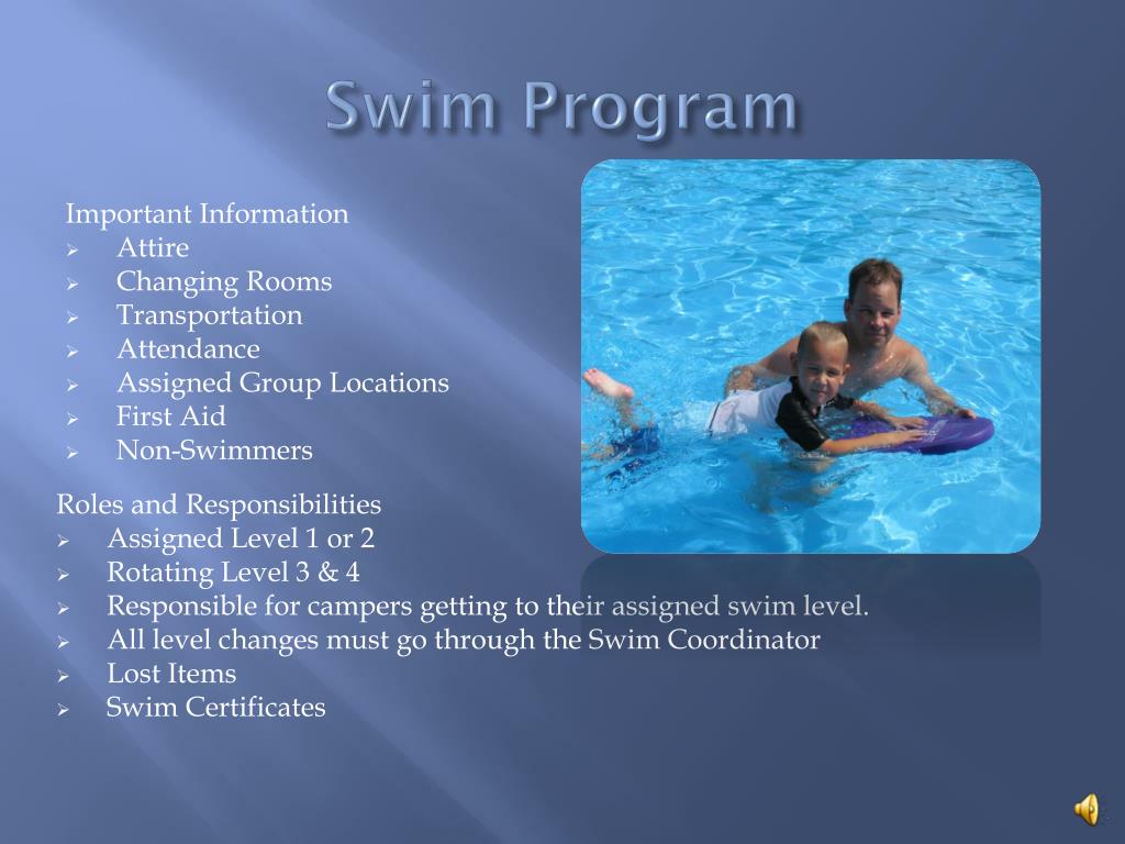 Swim Program Important Information • Attire • Changing Rooms • Transportation • Attendance • Assigned Group Locations • First Aid • Non-Swimmers Roles and Responsibilities • Assigned Level 1 or 2 • Rotating Level 3 & 4 • Responsible for campers getting to their assigned swim level. • All level changes must go through the Swim Coordinator • Lost Items • Swim Certificates
