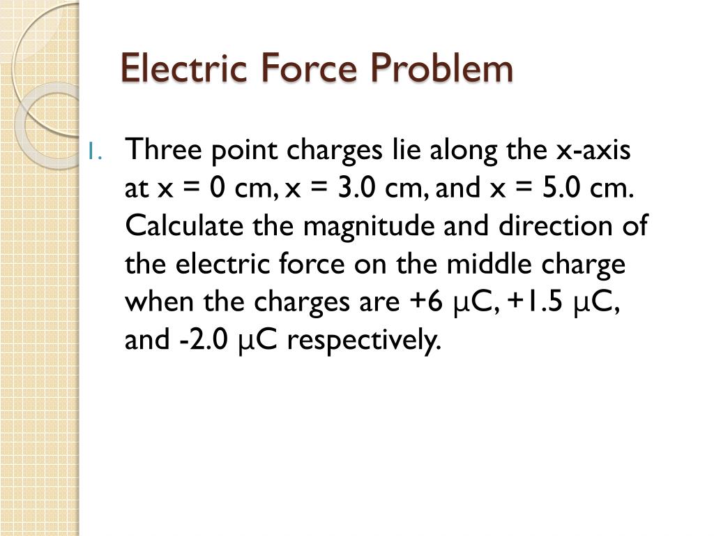 Electric Force Problem • Three point charges lie along the x-axis at x = 0 cm, x = 3.0 cm, and x = 5.0 cm. Calculate the magnitude and direction of the electric force on the middle charge when the charges are +6 μC, +1.5 μC, and -2.0 μC respectively.