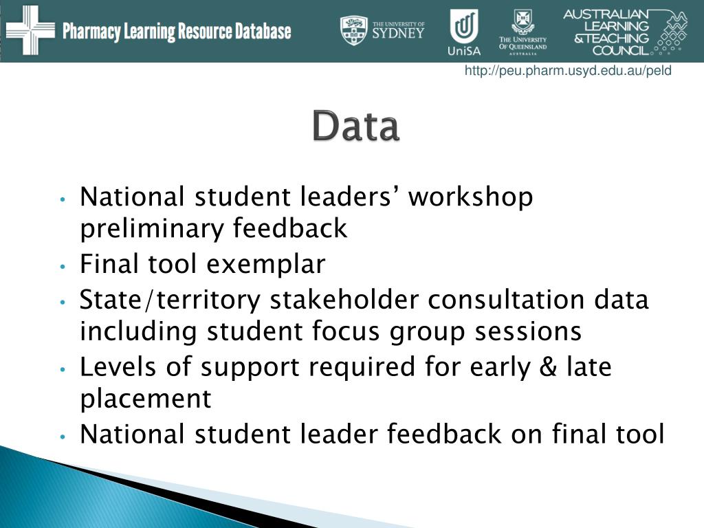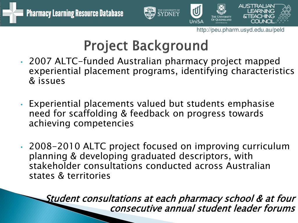 Project Background • 2007 ALTC-funded Australian pharmacy project mapped experiential placement programs, identifying characteristics & issues • Experiential placements valued but students emphasise need for scaffolding & feedback on progress towards achieving competencies • 2008-2010 ALTC project focused on improving curriculum planning & developing graduated descriptors, with stakeholder consultations conducted across Australian states & territories Student consultations at each pharmacy school & at four consecutive annual student leader forums