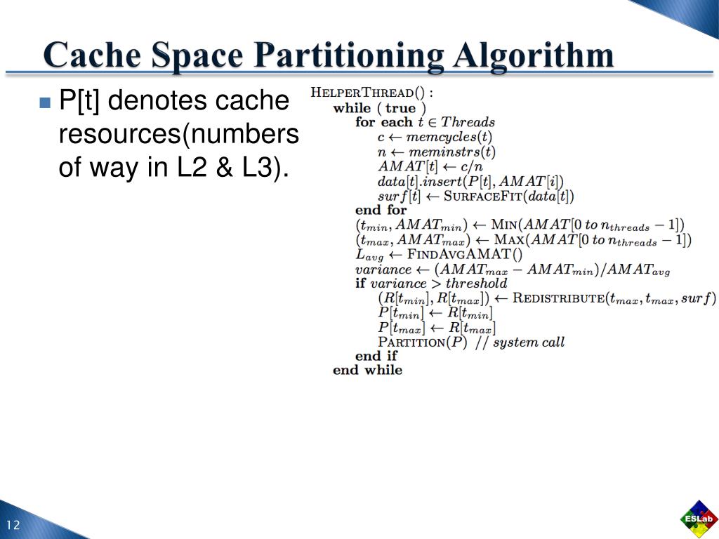 Cache Space Partitioning Algorithm • P[t] denotes cache resources(numbers of way in L2 & L3).