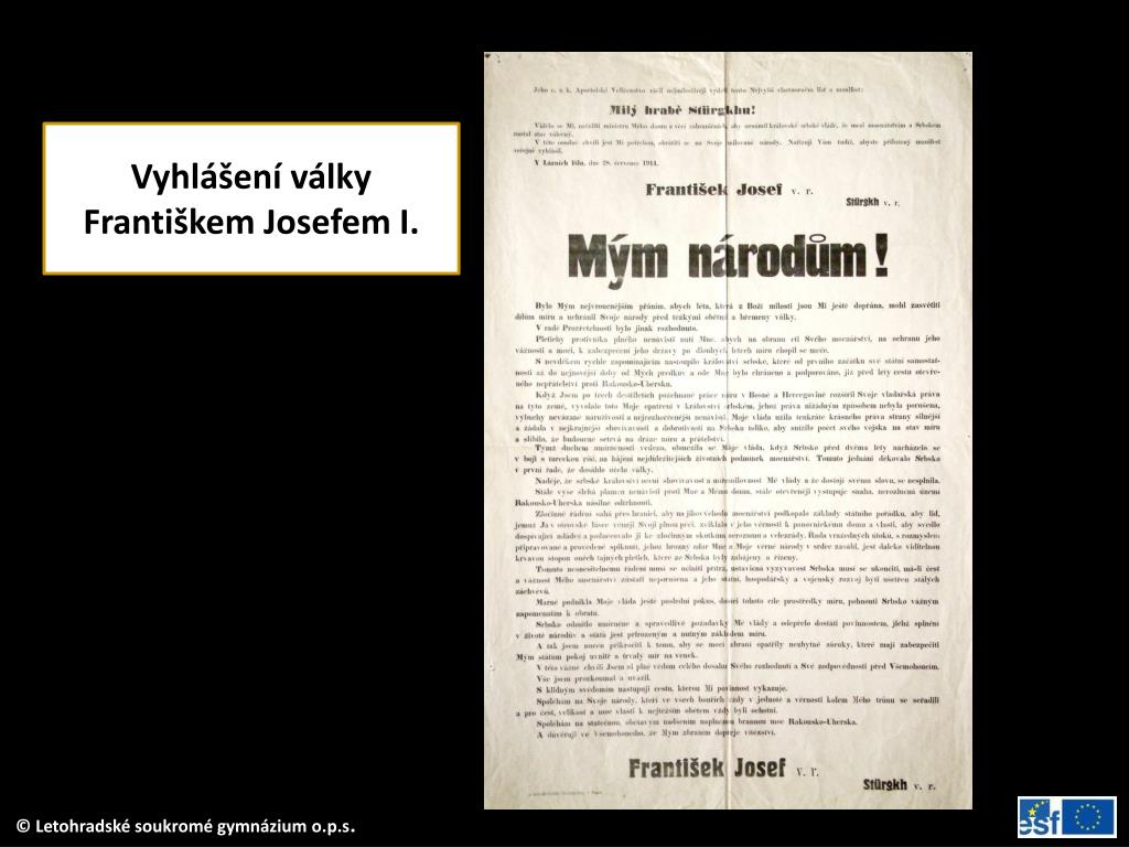 2. Tak nám zabili Ferdinanda", řekla posluhovačka panu Švejkovi a on z této informace v hospodě U kalicha prorocky usoudil, že "válka jest jistá". A byla. Těsně před polednem 28. července 1914 vyhlásilo Rakousko - Uhersko válku Srbsku a zběsilá ruleta první světové války začala nabírat rychlost.