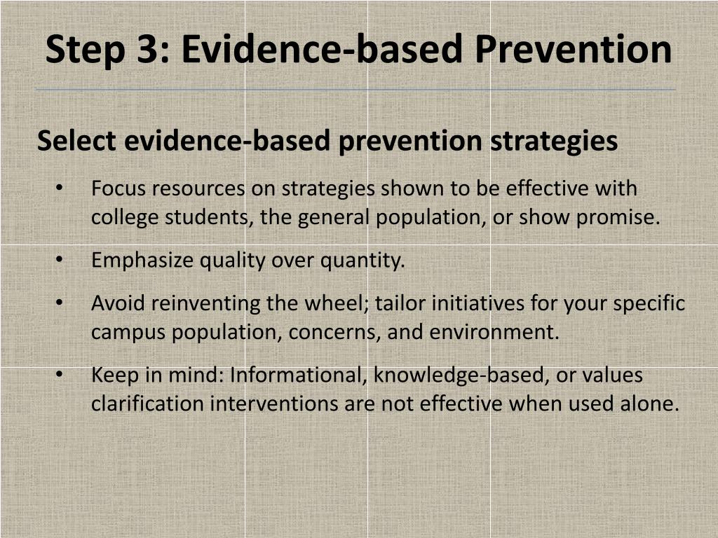 Step 3: Evidence-based Prevention • Select evidence-based prevention strategies • Focus resources on strategies shown to be effective with college students, the general population, or show promise. • Emphasize quality over quantity. • Avoid reinventing the wheel; tailor initiatives for your specific campus population, concerns, and environment. • Keep in mind: Informational, knowledge-based, or values clarification interventions are not effective when used alone.