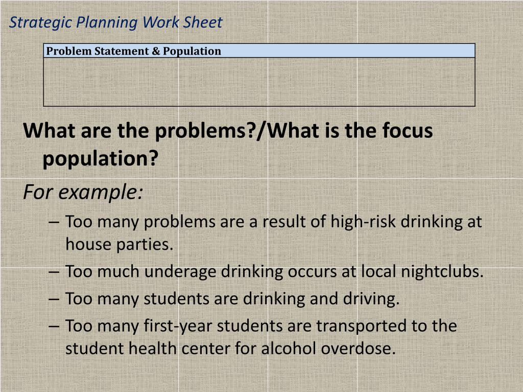 Strategic Planning Work Sheet What are the problems?/What is the focus population? For example: • Too many problems are a result of high-risk drinking at house parties. • Too much underage drinking occurs at local nightclubs. • Too many students are drinking and driving. • Too many first-year students are transported to the student health center for alcohol overdose.