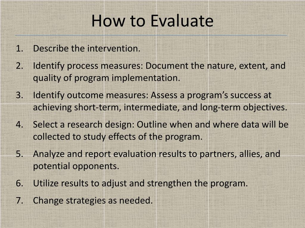 How to Evaluate Describe the intervention. Identify process measures: Document the nature, extent, and quality of program implementation. Identify outcome measures: Assess a program’s success at achieving short-term, intermediate, and long-term objectives. Select a research design: Outline when and where data will be collected to study effects of the program. Analyze and report evaluation results to partners, allies, and potential opponents. Utilize results to adjust and strengthen the program. Change strategies as needed.