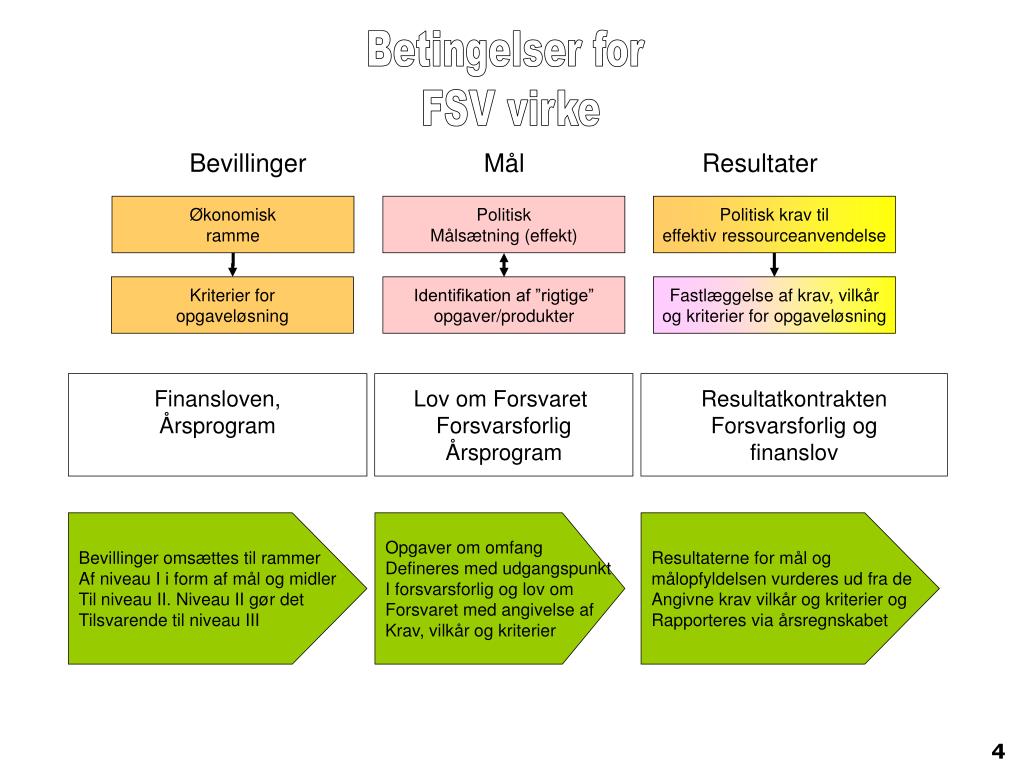 Bevillinger Mål Resultater Økonomisk ramme Politisk Målsætning (effekt) Politisk krav til effektiv ressourceanvendelse Kriterier for opgaveløsning Identifikation af ”rigtige” opgaver/produkter Fastlæggelse af krav, vilkår og kriterier for opgaveløsning Finansloven, Årsprogram Lov om Forsvaret Forsvarsforlig Årsprogram Resultatkontrakten Forsvarsforlig og finanslov Bevillinger omsættes til rammer Af niveau I i form af mål og midler Til niveau II. Niveau II gør det Tilsvarende til niveau III Opgaver om omfang Defineres med udgangspunkt I forsvarsforlig og lov om Forsvaret med angivelse af Krav, vilkår og kriterier Resultaterne for mål og målopfyldelsen vurderes ud fra de Angivne krav vilkår og kriterier og Rapporteres via årsregnskabet Betingelser for FSV virke 4