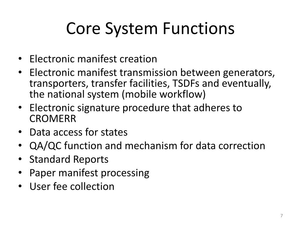 Core System Functions • Electronic manifest creation • Electronic manifest transmission between generators, transporters, transfer facilities, TSDFs and eventually, the national system (mobile workflow) • Electronic signature procedure that adheres to CROMERR • Data access for states • QA/QC function and mechanism for data correction • Standard Reports • Paper manifest processing • User fee collection