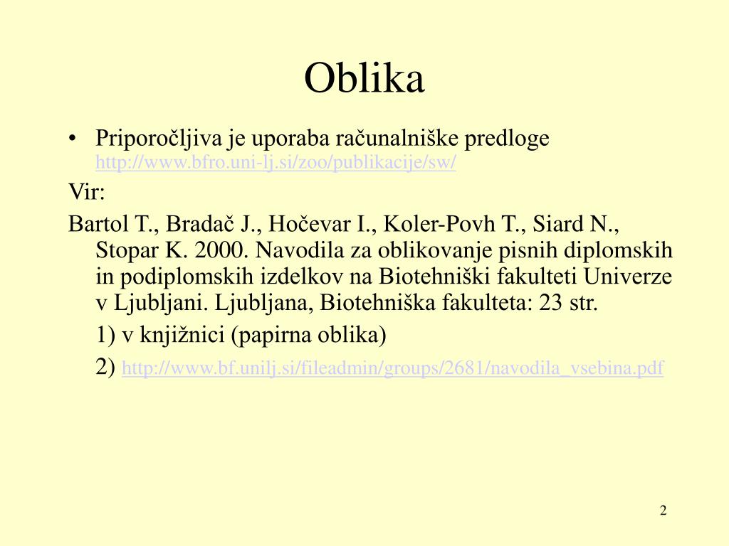 Oblika • Priporočljiva je uporaba računalniške predlogehttp://www.bfro.uni-lj.si/zoo/publikacije/sw/ Vir: Bartol T., Bradač J., Hočevar I., Koler-Povh T., Siard N., Stopar K. 2000. Navodila za oblikovanje pisnih diplomskih in podiplomskih izdelkov na Biotehniški fakulteti Univerze v Ljubljani. Ljubljana, Biotehniška fakulteta: 23 str. 1) v knjižnici (papirna oblika) 2) http://www.bf.unilj.si/fileadmin/groups/2681/navodila_vsebina.pdf
