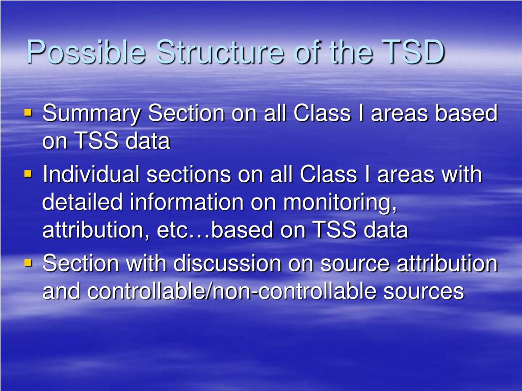 Possible Structure of the TSD • Summary Section on all Class I areas based on TSS data • Individual sections on all Class I areas with detailed information on monitoring, attribution, etc…based on TSS data • Section with discussion on source attribution and controllable/non-controllable sources