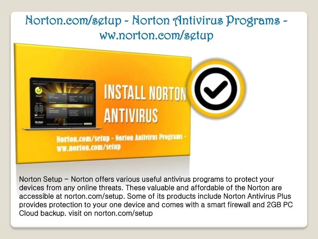 Norton.com/setup Norton.com/setup - - Norton Antivirus Programs Norton Antivirus Programs - - ww.norton.com/setup ww.norton.com/setup Norton Setup Norton Setup - - Norton offers various useful antivirus programs to protect your Norton offers various useful antivirus programs to protect your devices from any online threats. These valuable and affordable of the Norton are devices from any online threats. These valuable and affordable of the Norton are accessible at norton.com/setup. Some of its products include Norton Antivirus Plus accessible at norton.com/setup. Some of its products include Norton Antivirus Plus provides protection to your one device and comes with a smart firewall and 2GB PC provides protection to your one device and comes with a smart firewall and 2GB PC Cloud backup. visit on norton.com/setup Cloud backup. visit on norton.com/setup