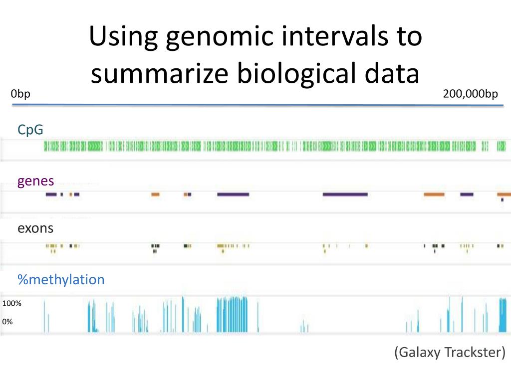 0bp 200,000bp CpG Using genomic intervals to summarize biological data genes exons ex %methylation 100% 0% (Galaxy Trackster)