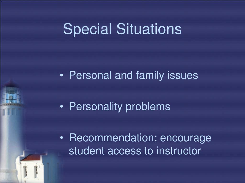 Special Situations • Personal and family issues • Personality problems • Recommendation: encourage student access to instructor