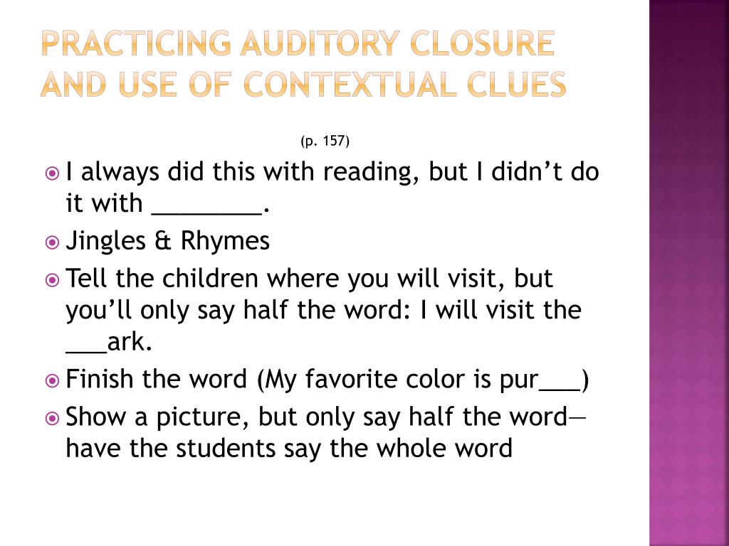 Practicing auditory closure and use of contextual clues (p. 157) • I always did this with reading, but I didn’t do it with ________. • Jingles & Rhymes • Tell the children where you will visit, but you’ll only say half the word: I will visit the ___ark. • Finish the word (My favorite color is pur___) • Show a picture, but only say half the word—have the students say the whole word