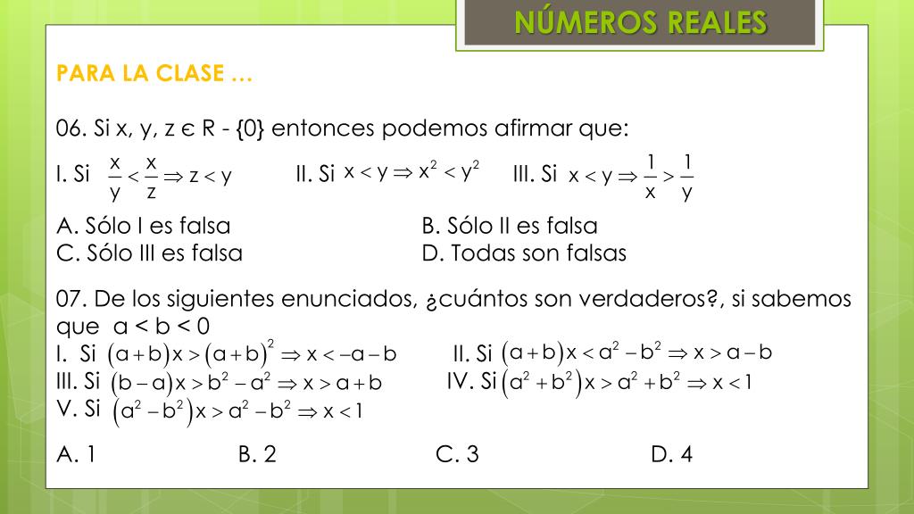 NÚMEROS REALES • PARA LA CLASE … • 06. Si x, y, z є R - {0} entonces podemos afirmar que: • I. Si II. Si III. Si • A. Sólo I es falsa B. Sólo II es falsa • C. Sólo III es falsa D. Todas son falsas • 07. De los siguientes enunciados, ¿cuántos son verdaderos?, si sabemos que a < b < 0 • I. Si II. Si • III. Si IV. Si • V. Si • A. 1 B. 2 C. 3 D. 4