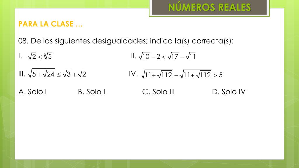 NÚMEROS REALES • PARA LA CLASE … • 08. De las siguientes desigualdades; indica la(s) correcta(s): • II. • IV. • A. Solo I B. Solo II C. Solo III D. Solo IV