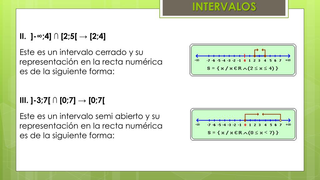 INTERVALOS II. ]-∞;4] ∩ [2;5[ → [2;4] Este es un intervalo cerrado y su representación en la recta numérica es de la siguiente forma: III. ]-3;7[ ∩ [0;7] → [0;7[ Este es un intervalo semi abierto y su representación en la recta numérica es de la siguiente forma:
