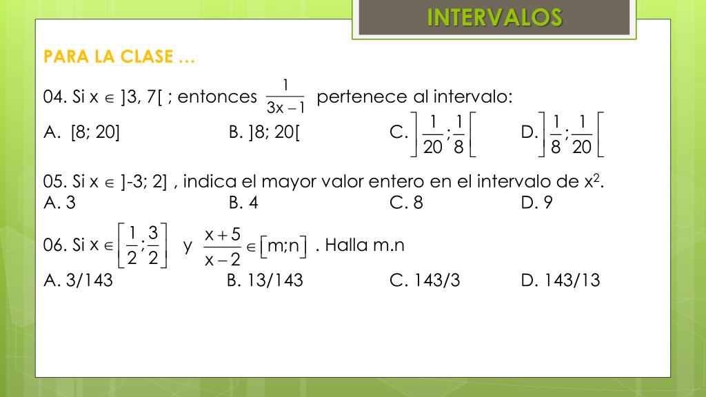 INTERVALOS • PARA LA CLASE … • 04. Si x ]3, 7[; entonces pertenece al intervalo: • [8; 20] B. ]8; 20[ C. D. • 05. Si x ]-3; 2] , indica el mayor valor entero en el intervalo de x2. • A. 3 B. 4 C. 8 D. 9 • 06. Si y . Halla m.n • A. 3/143 B. 13/143 C. 143/3 D. 143/13