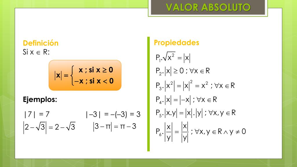 VALOR ABSOLUTO • Propiedades • Definición • Si x R: • Ejemplos: • |7| = 7 |–3| = –(–3) = 3