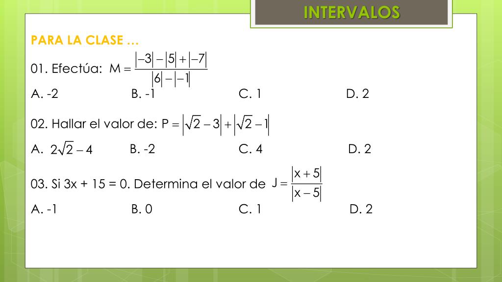 INTERVALOS • PARA LA CLASE … • 01. Efectúa: • A. -2 B. -1 C. 1 D. 2 • 02. Hallar el valor de: • B. -2 C. 4 D. 2 • 03. Si 3x + 15 = 0. Determina el valor de • A. -1 B. 0 C. 1 D. 2