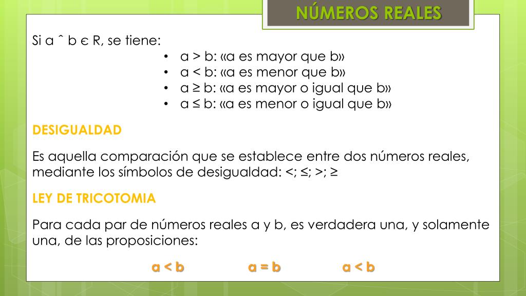 NÚMEROS REALES • Si a ˆ b є R, se tiene: • a > b: «a es mayor que b» • a < b: «a es menor que b» • a ≥ b: «a es mayor o igual que b» • a ≤ b: «a es menor o igual que b» • DESIGUALDAD • Es aquella comparación que se establece entre dos números reales, mediante los símbolos de desigualdad: <; ≤; >; ≥ • LEY DE TRICOTOMIA • Para cada par de números reales a y b, es verdadera una, y solamente una, de las proposiciones: • a < b a = b a < b