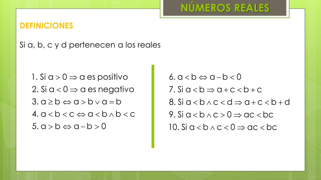 NÚMEROS REALES DEFINICIONES Si a, b, c y d pertenecen a los reales