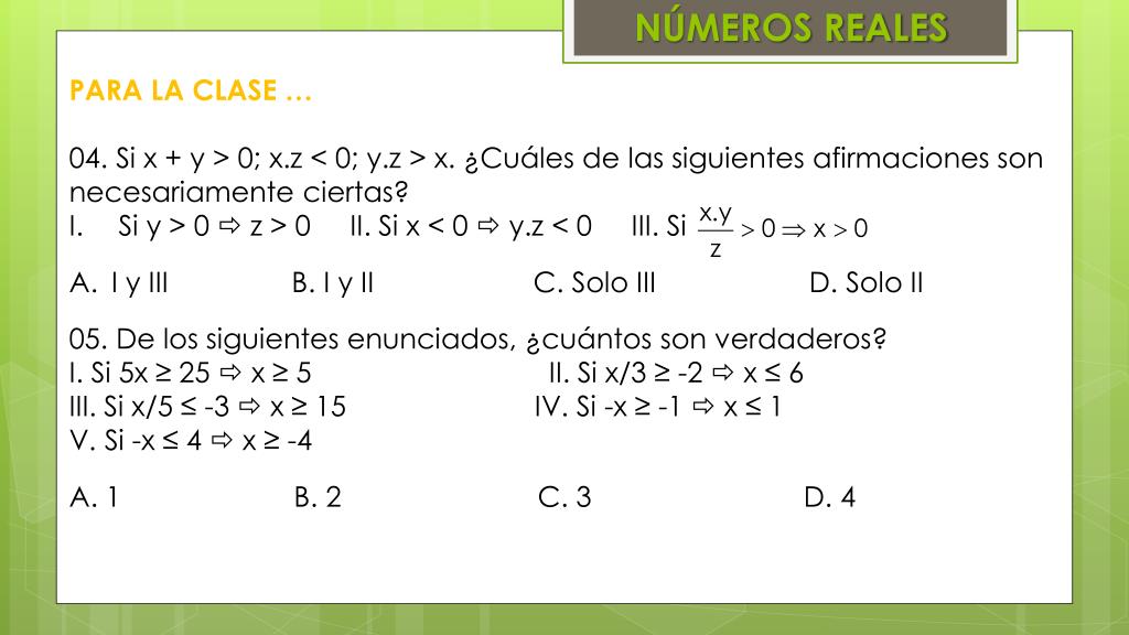NÚMEROS REALES • PARA LA CLASE … • 04. Si x + y > 0; x.z < 0; y.z > x. ¿Cuáles de las siguientes afirmaciones son necesariamente ciertas? • Si y > 0 z > 0 II. Si x < 0 y.z< 0 III. Si • I y III B. I y II C. Solo III D. Solo II • 05. De los siguientes enunciados, ¿cuántos son verdaderos? • I. Si 5x ≥ 25 x ≥ 5 II. Si x/3 ≥ -2 x ≤ 6 • III. Si x/5 ≤ -3 x ≥ 15 IV. Si -x ≥ -1 x ≤ 1 • V. Si -x ≤ 4 x ≥ -4 • A. 1 B. 2 C. 3 D. 4