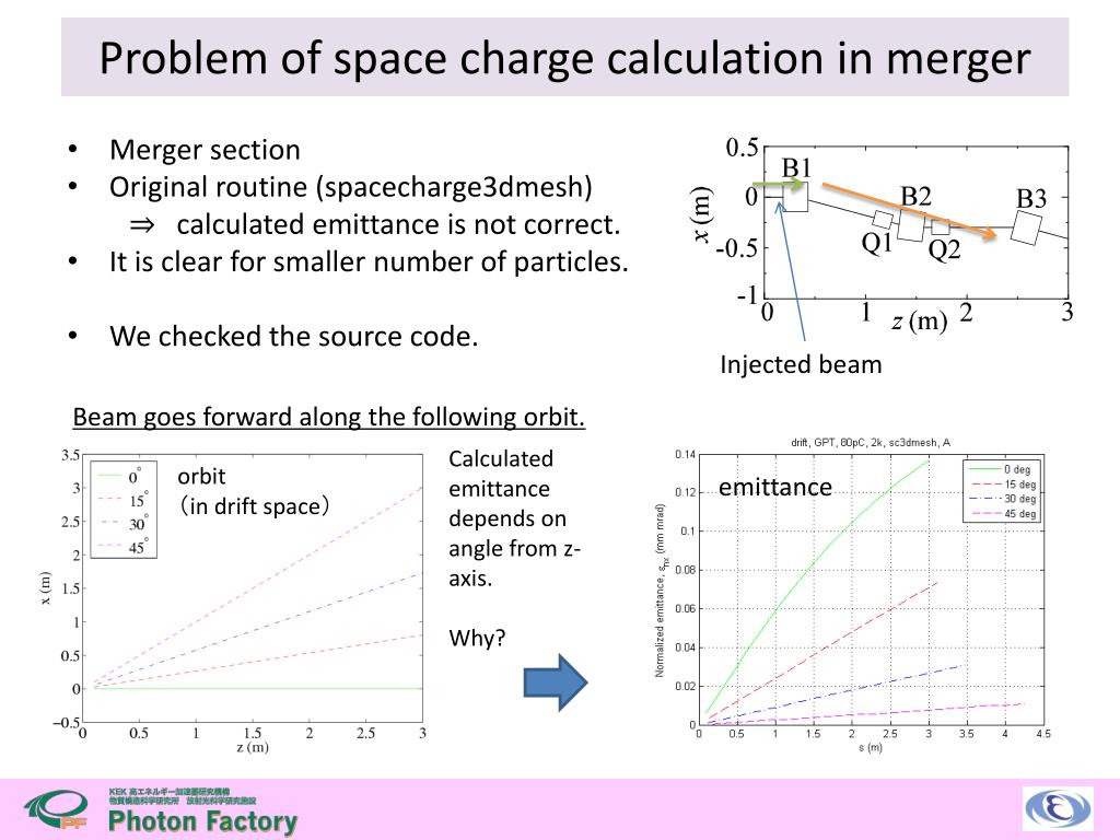 Problem of space charge calculation in merger • Merger section • Original routine (spacecharge3dmesh) ⇒ calculated emittance is not correct. • It is clear for smaller number of particles. • We checked the source code. Injected beam Beam goes forward along the following orbit. Calculated emittance depends on angle from z-axis. Why? orbit (in drift space) emittance