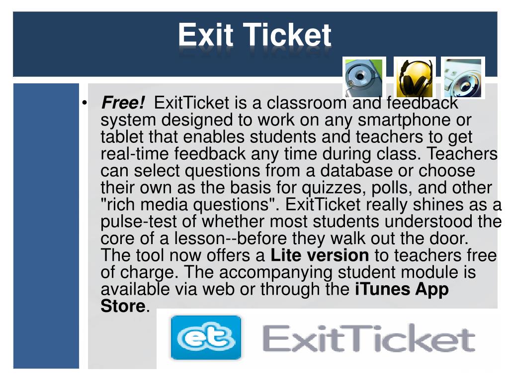 Exit Ticket • Free!ExitTicket is a classroom and feedback system designed to work on any smartphone or tablet that enables students and teachers to get real-time feedback any time during class. Teachers can select questions from a database or choose their own as the basis for quizzes, polls, and other "rich media questions". ExitTicket really shines as a pulse-test of whether most students understood the core of a lesson--before they walk out the door. The tool now offers a Lite version to teachers free of charge. The accompanying student module is available via web or through the iTunes App Store.