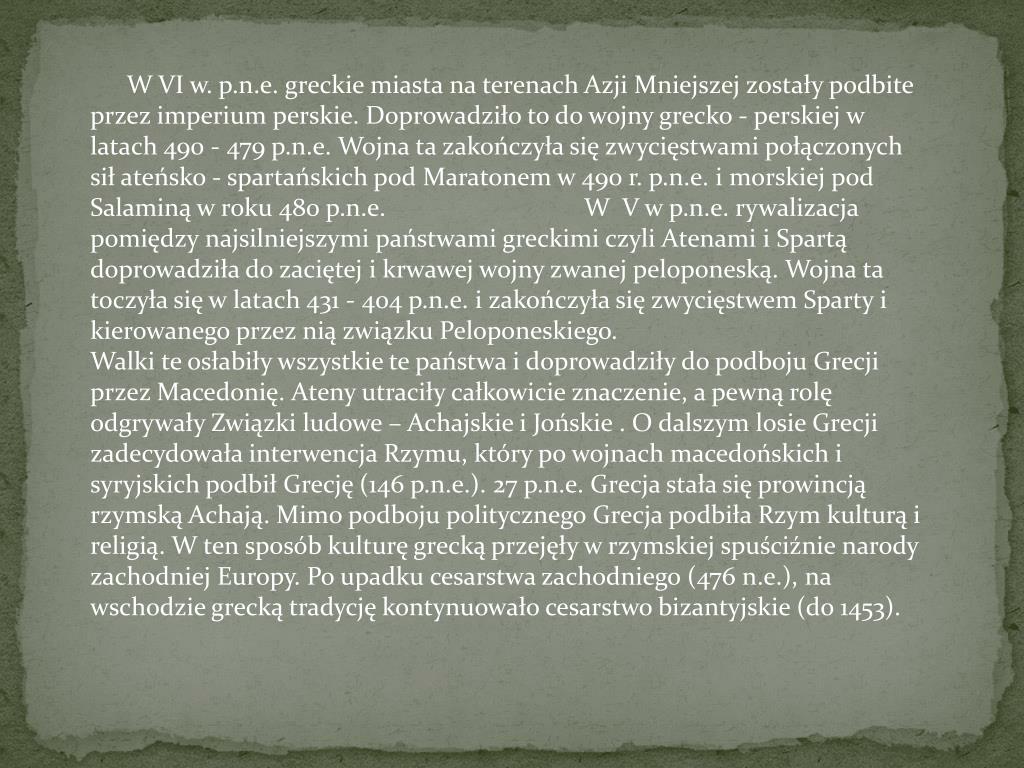 W VI w. p.n.e. greckie miasta na terenach Azji Mniejszej zostały podbite przez imperium perskie. Doprowadziło to do wojny grecko - perskiej w latach 490 - 479 p.n.e. Wojna ta zakończyła się zwycięstwami połączonych sił ateńsko - spartańskich pod Maratonem w 490 r. p.n.e. i morskiej pod Salaminą w roku 480 p.n.e. W V w p.n.e. rywalizacja pomiędzy najsilniejszymi państwami greckimi czyli Atenami i Spartą doprowadziła do zaciętej i krwawej wojny zwanej peloponeską. Wojna ta toczyła się w latach 431 - 404 p.n.e. i zakończyła się zwycięstwem Sparty i kierowanego przez nią związku Peloponeskiego. Walki te osłabiły wszystkie te państwa i doprowadziły do podboju Grecji przez Macedonię. Ateny utraciły całkowicie znaczenie, a pewną rolę odgrywały Związki ludowe – Achajskie i Jońskie . O dalszym losie Grecji zadecydowała interwencja Rzymu, który po wojnach macedońskich i syryjskich podbił Grecję (146 p.n.e.). 27 p.n.e. Grecja stała się prowincją rzymską Achają. Mimo podboju politycznego Grecja podbiła Rzym kulturą i religią. W ten sposób kulturę grecką przejęły w rzymskiej spuściźnie narody zachodniej Europy. Po upadku cesarstwa zachodniego (476 n.e.), na wschodzie grecką tradycję kontynuowało cesarstwo bizantyjskie (do 1453).