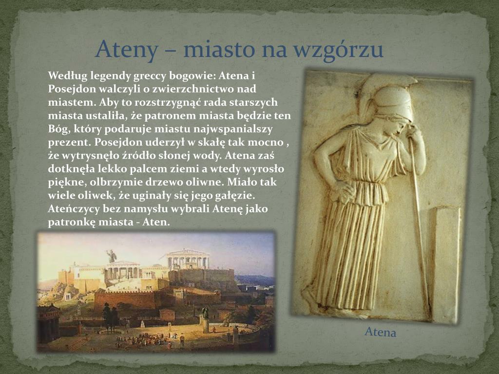 Ateny – miasto na wzgórzu Według legendy greccy bogowie: Atena i Posejdon walczyli o zwierzchnictwo nad miastem. Aby to rozstrzygnąć rada starszych miasta ustaliła, że patronem miasta będzie ten Bóg, który podaruje miastu najwspanialszy prezent. Posejdon uderzył w skałę tak mocno , że wytrysnęło źródło słonej wody. Atena zaś dotknęła lekko palcem ziemi a wtedy wyrosło piękne, olbrzymie drzewo oliwne. Miało tak wiele oliwek, że uginały się jego gałęzie. Ateńczycy bez namysłu wybrali Atenę jako patronkę miasta - Aten. Atena