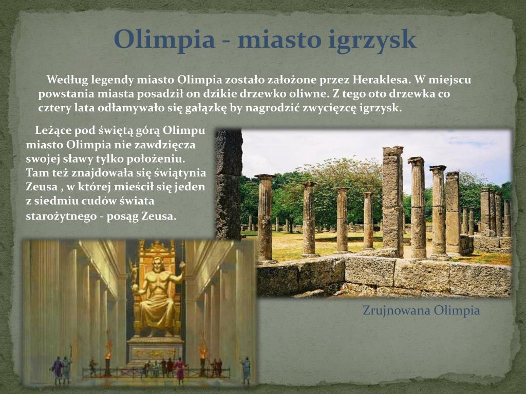 Olimpia - miasto igrzysk Według legendy miasto Olimpia zostało założone przez Heraklesa. W miejscu powstania miasta posadził on dzikie drzewko oliwne. Z tego oto drzewka co cztery lata odłamywało się gałązkę by nagrodzić zwycięzcę igrzysk. Leżące pod świętą górą Olimpu miasto Olimpia nie zawdzięcza swojej sławy tylko położeniu. Tam też znajdowała się świątynia Zeusa , w której mieścił się jeden z siedmiu cudów świata starożytnego - posąg Zeusa. Zrujnowana Olimpia