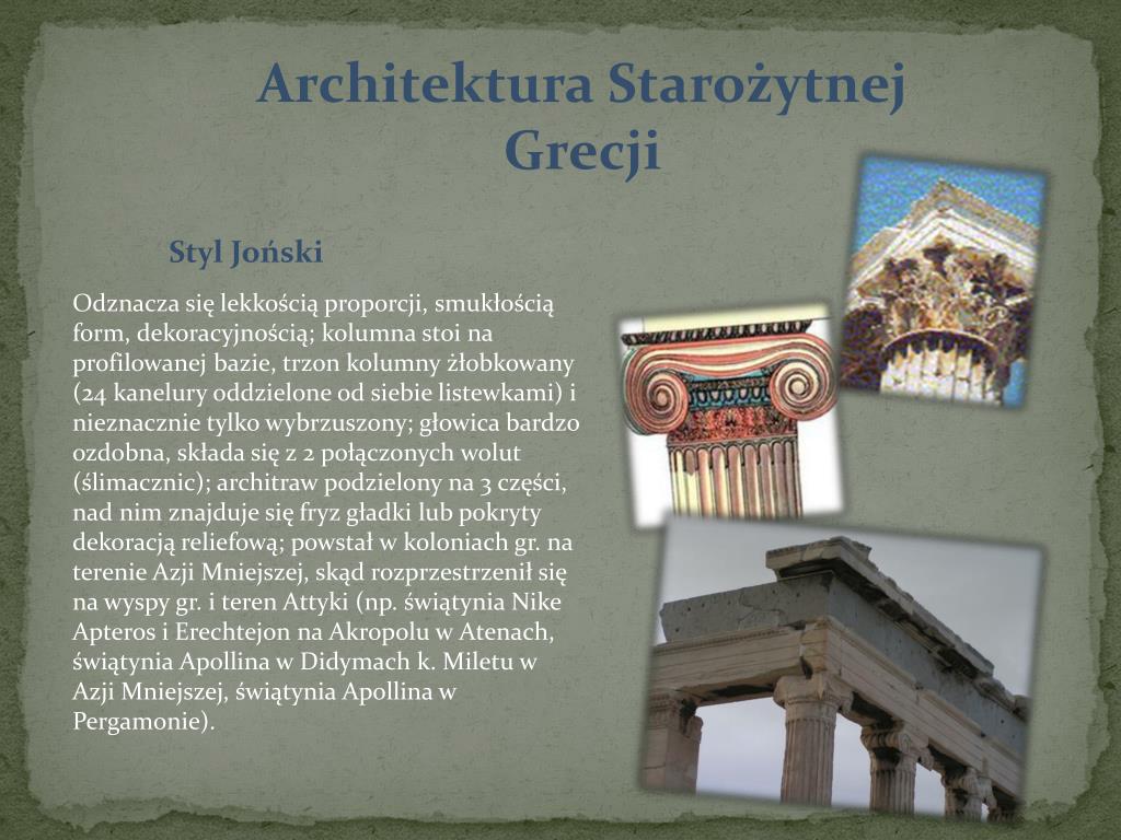 Architektura Starożytnej Grecji Odznacza się lekkością proporcji, smukłością form, dekoracyjnością; kolumna stoi na profilowanej bazie, trzon kolumny żłobkowany (24 kanelury oddzielone od siebie listewkami) i nieznacznie tylko wybrzuszony; głowica bardzo ozdobna, składa się z 2 połączonych wolut (ślimacznic); architraw podzielony na 3 części, nad nim znajduje się fryz gładki lub pokryty dekoracją reliefową; powstał w koloniach gr. na terenie Azji Mniejszej, skąd rozprzestrzenił się na wyspy gr. i teren Attyki (np. świątynia Nike Apteros i Erechtejon na Akropolu w Atenach, świątynia Apollina w Didymach k. Miletu w Azji Mniejszej, świątynia Apollina w Pergamonie). Styl Joński
