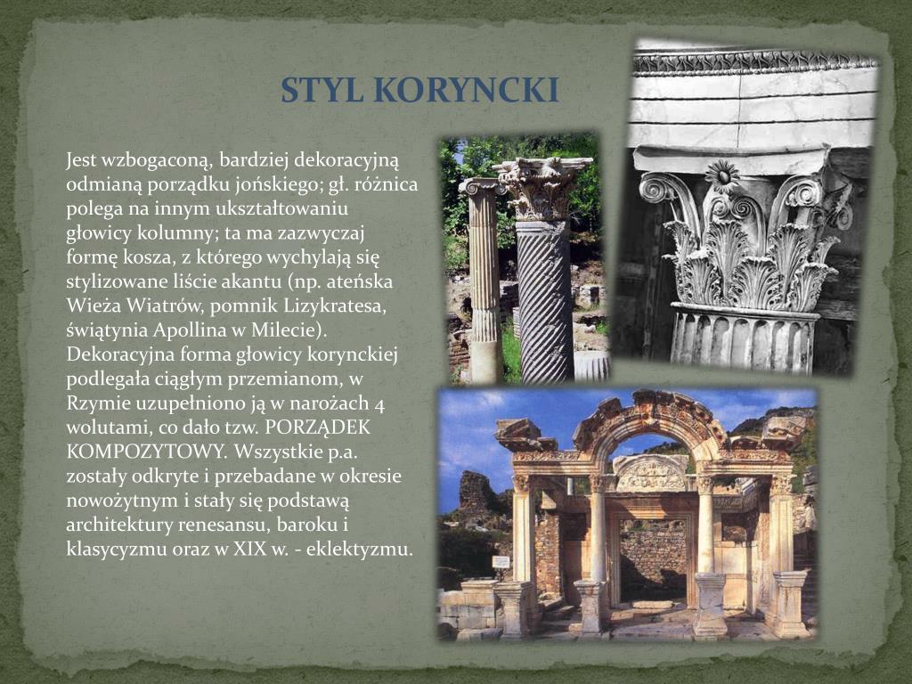 STYL KORYNCKI Jest wzbogaconą, bardziej dekoracyjną odmianą porządku jońskiego; gł. różnica polega na innym ukształtowaniu głowicy kolumny; ta ma zazwyczaj formę kosza, z którego wychylają się stylizowane liście akantu (np. ateńska Wieża Wiatrów, pomnik Lizykratesa, świątynia Apollina w Milecie). Dekoracyjna forma głowicy korynckiej podlegała ciągłym przemianom, w Rzymie uzupełniono ją w narożach 4 wolutami, co dało tzw. PORZĄDEK KOMPOZYTOWY. Wszystkie p.a. zostały odkryte i przebadane w okresie nowożytnym i stały się podstawą architektury renesansu, baroku i klasycyzmu oraz w XIX w. - eklektyzmu.