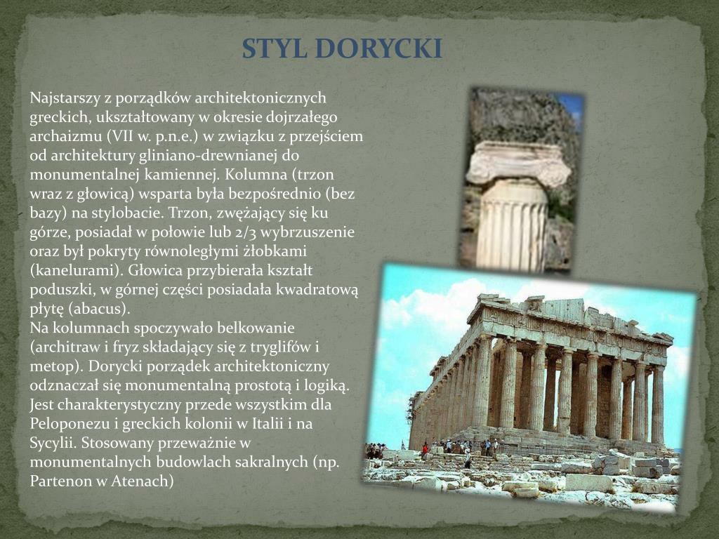STYL DORYCKI Najstarszy z porządków architektonicznych greckich, ukształtowany w okresie dojrzałego archaizmu (VII w. p.n.e.) w związku z przejściem od architektury gliniano-drewnianej do monumentalnej kamiennej.Kolumna (trzon wraz z głowicą) wsparta była bezpośrednio (bez bazy) na stylobacie. Trzon, zwężający się ku górze, posiadał w połowie lub 2/3 wybrzuszenie oraz był pokryty równoległymi żłobkami (kanelurami). Głowica przybierała kształt poduszki, w górnej części posiadała kwadratową płytę (abacus).Na kolumnach spoczywało belkowanie (architraw i fryz składający się z tryglifów i metop). Dorycki porządek architektoniczny odznaczał się monumentalną prostotą i logiką.Jest charakterystyczny przede wszystkim dla Peloponezu i greckich kolonii w Italii i na Sycylii. Stosowany przeważnie w monumentalnych budowlach sakralnych (np. Partenon w Atenach)
