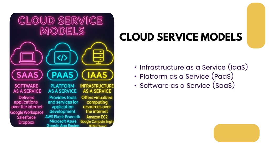 CLOUD SERVICE MODELS • Infrastructure as a Service (IaaS) • Platform as a Service (PaaS) • Software as a Service (SaaS)