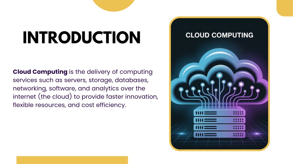 INTRODUCTION Cloud Computing is the delivery of computing services such as servers, storage, databases, networking, software, and analytics over the internet (the cloud) to provide faster innovation, flexible resources, and cost efficiency.
