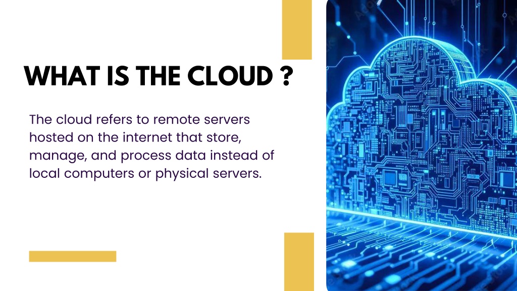 WHAT IS THE CLOUD ? The cloud refers to remote servers hosted on the internet that store, manage, and process data instead of local computers or physical servers.