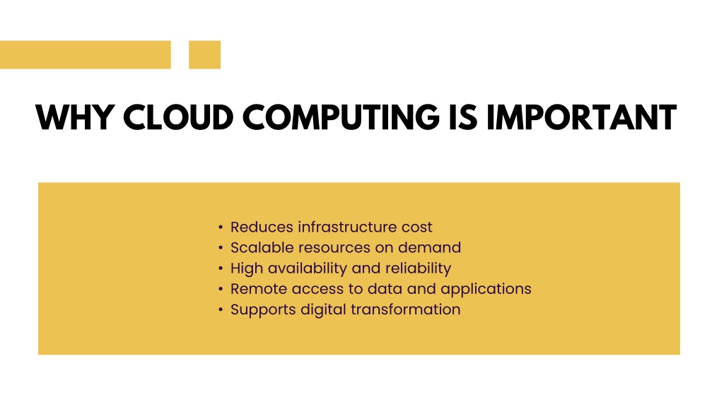 WHY CLOUD COMPUTING IS IMPORTANT • Reduces infrastructure cost • Scalable resources on demand • High availability and reliability • Remote access to data and applications • Supports digital transformation