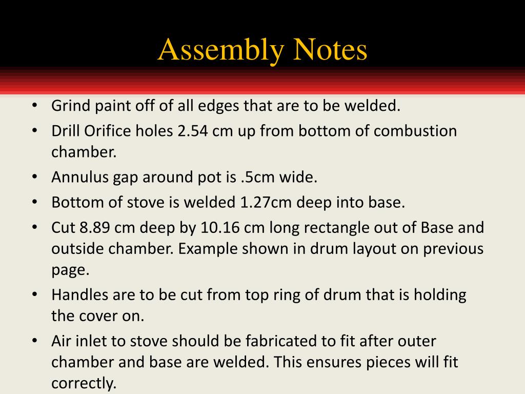 Assembly Notes • Grind paint off of all edges that are to be welded. • Drill Orifice holes 2.54 cm up from bottom of combustion chamber. • Annulus gap around pot is .5cm wide. • Bottom of stove is welded 1.27cm deep into base. • Cut8.89 cm deep by 10.16 cm long rectangle out of Base and outside chamber. Example shown in drum layout on previous page. • Handles are to be cut from top ring of drum that is holding the cover on. • Air inlet to stove should be fabricated to fit after outer chamber and base are welded. This ensures pieces will fit correctly.