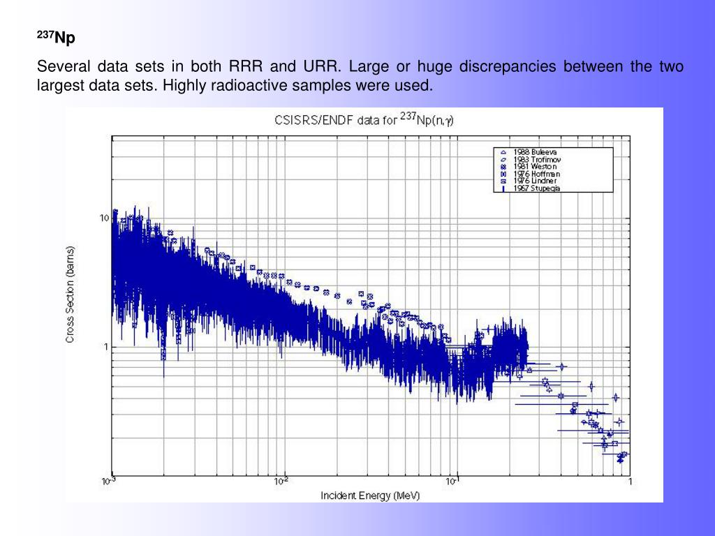 237Np Several data sets in both RRR and URR. Large or huge discrepancies between the two largest data sets. Highly radioactive samples were used.
