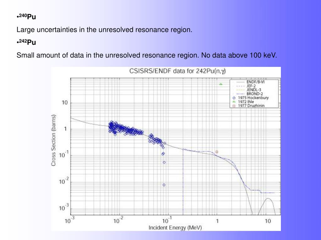240Pu • Large uncertainties in the unresolved resonance region. • 242Pu • Small amount of data in the unresolved resonance region. No data above 100 keV.