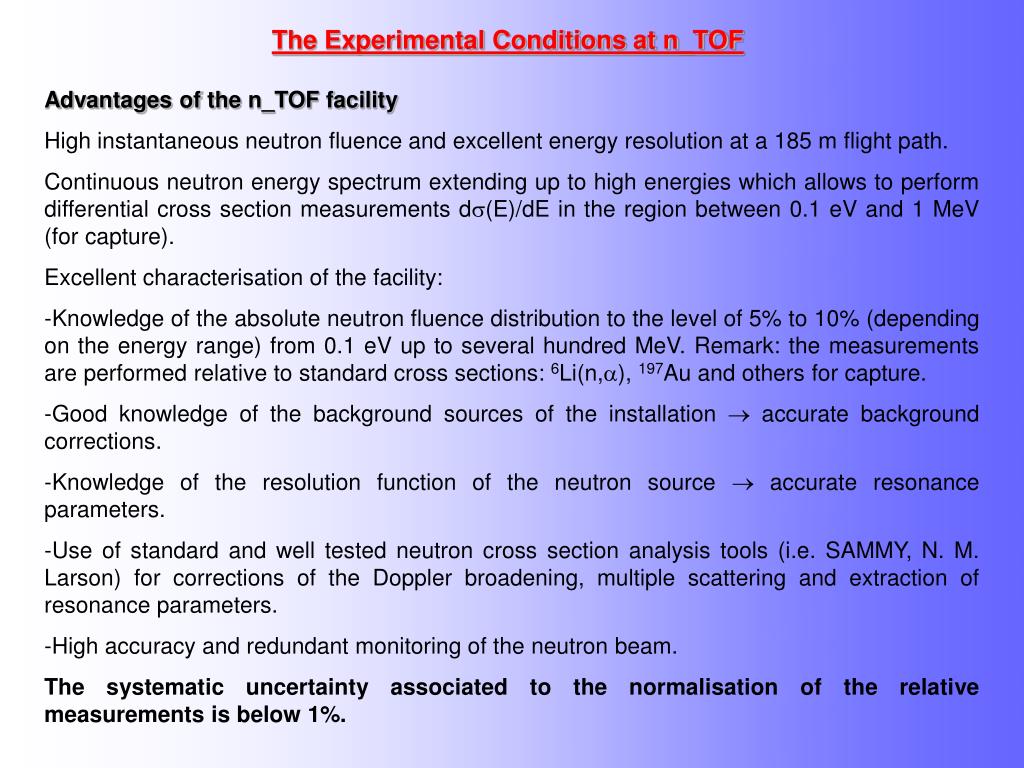 The Experimental Conditions at n_TOF • Advantages of the n_TOF facility • High instantaneous neutron fluence and excellent energy resolution at a 185 m flight path. • Continuous neutron energy spectrum extending up to high energies which allows to perform differential cross section measurements ds(E)/dE in the region between 0.1 eV and 1 MeV (for capture). • Excellent characterisation of the facility: • Knowledge of the absolute neutron fluence distribution to the level of 5% to 10% (depending on the energy range) from 0.1 eV up to several hundred MeV. Remark: the measurements are performed relative to standard cross sections: 6Li(n,a), 197Au and others for capture. • Good knowledge of the background sources of the installation accurate background corrections. • Knowledge of the resolution function of the neutron source accurate resonance parameters. • Use of standard and well tested neutron cross section analysis tools (i.e. SAMMY, N. M. Larson) for corrections of the Doppler broadening, multiple scattering and extraction of resonance parameters. • -High accuracy and redundant monitoring of the neutron beam. • The systematic uncertainty associated to the normalisation of the relative measurements is below 1%.