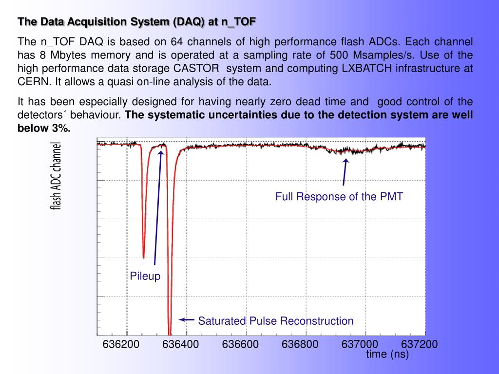 Full Response of the PMT Pileup Saturated Pulse Reconstruction 636200 636400 636600 636800 637000 637200 time (ns) The Data Acquisition System (DAQ) at n_TOF The n_TOF DAQ is based on 64 channels of high performance flash ADCs. Each channel has 8 Mbytes memory and is operated at a sampling rate of 500 Msamples/s. Use of the high performance data storage CASTOR system and computing LXBATCH infrastructure at CERN. It allows a quasi on-line analysis of the data. It has been especially designed for having nearly zero dead time and good control of the detectors´ behaviour. The systematic uncertainties due to the detection system are well below 3%.