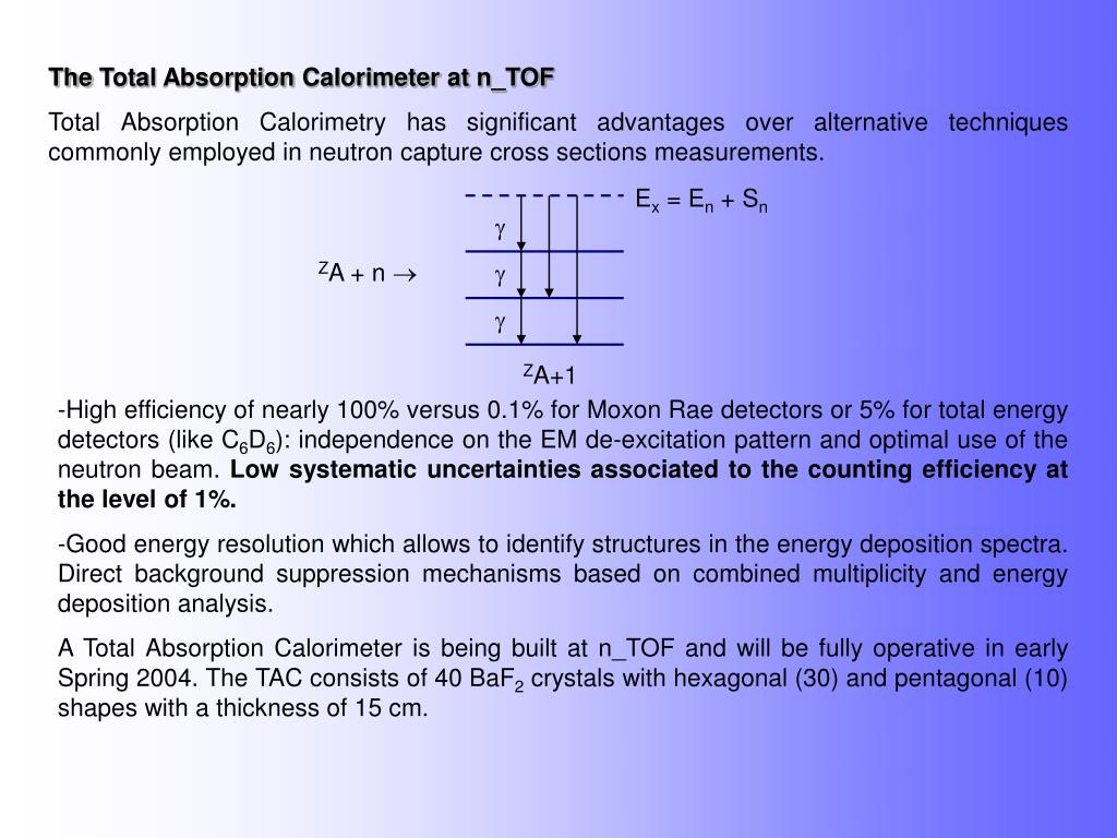 The Total Absorption Calorimeter at n_TOF Total Absorption Calorimetry has significant advantages over alternative techniques commonly employed in neutron capture cross sections measurements. Ex = En + Sn g ZA + n g g ZA+1 • High efficiency of nearly 100% versus 0.1% for Moxon Rae detectors or 5% for total energy detectors (like C6D6): independence on the EM de-excitation pattern and optimal use of the neutron beam. Low systematic uncertainties associated to the counting efficiency at the level of 1%. • Good energy resolution which allows to identify structures in the energy deposition spectra. Direct background suppression mechanisms based on combined multiplicity and energy deposition analysis. • A Total Absorption Calorimeter is being built at n_TOF and will be fully operative in early Spring 2004. The TAC consists of 40 BaF2 crystals with hexagonal (30) and pentagonal (10) shapes with a thickness of 15 cm.