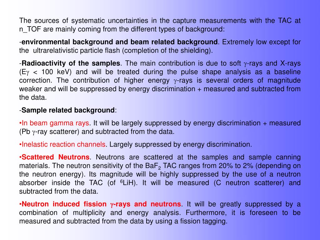The sources of systematic uncertainties in the capture measurements with the TAC at n_TOF are mainly coming from the different types of background: • environmental background and beam related background. Extremely low except for the ultrarelativistic particle flash (completion of the shielding). • Radioactivity of the samples. The main contribution is due to soft g-rays and X-rays (Eg < 100 keV) and will be treated during the pulse shape analysis as a baseline correction. The contribution of higher energy g-rays is several orders of magnitude weaker and will be suppressed by energy discrimination + measured and subtracted from the data. • Sample related background: • In beam gamma rays. It will be largely suppressed by energy discrimination + measured (Pb g-ray scatterer) and subtracted from the data. • Inelastic reaction channels. Largely suppressed by energy discrimination. • Scattered Neutrons. Neutrons are scattered at the samples and sample canning materials. The neutron sensitivity of the BaF2 TAC ranges from 20% to 2% (depending on the neutron energy). Its magnitude will be highly suppressed by the use of a neutron absorber inside the TAC (of 6LiH). It will be measured (C neutron scatterer) and subtracted from the data. • Neutron induced fission g-rays and neutrons. It will be greatly suppressed by a combination of multiplicity and energy analysis. Furthermore, it is foreseen to be measured and subtracted from the data by using a fission tagging.