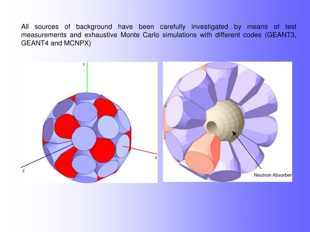 All sources of background have been carefully investigated by means of test measurements and exhaustive Monte Carlo simulations with different codes (GEANT3, GEANT4 and MCNPX)