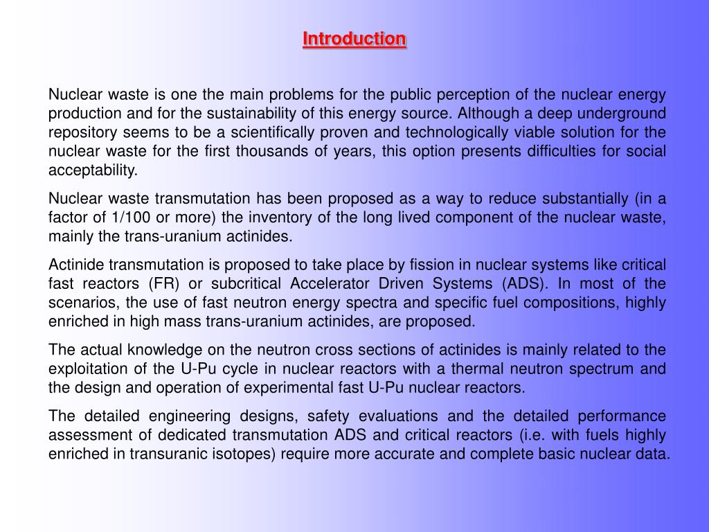 Introduction Nuclear waste is one the main problems for the public perception of the nuclear energy production and for the sustainability of this energy source. Although a deep underground repository seems to be a scientifically proven and technologically viable solution for the nuclear waste for the first thousands of years, this option presents difficulties for social acceptability. Nuclear waste transmutation has been proposed as a way to reduce substantially (in a factor of 1/100 or more) the inventory of the long lived component of the nuclear waste, mainly the trans-uranium actinides. Actinide transmutation is proposed to take place by fission in nuclear systems like critical fast reactors (FR) or subcritical Accelerator Driven Systems (ADS). In most of the scenarios, the use of fast neutron energy spectra and specific fuel compositions, highly enriched in high mass trans-uranium actinides, are proposed. The actual knowledge on the neutron cross sections of actinides is mainly related to the exploitation of the U-Pu cycle in nuclear reactors with a thermal neutron spectrum and the design and operation of experimental fast U-Pu nuclear reactors. The detailed engineering designs, safety evaluations and the detailed performance assessment of dedicated transmutation ADS and critical reactors (i.e. with fuels highly enriched in transuranic isotopes) require more accurate and complete basic nuclear data.